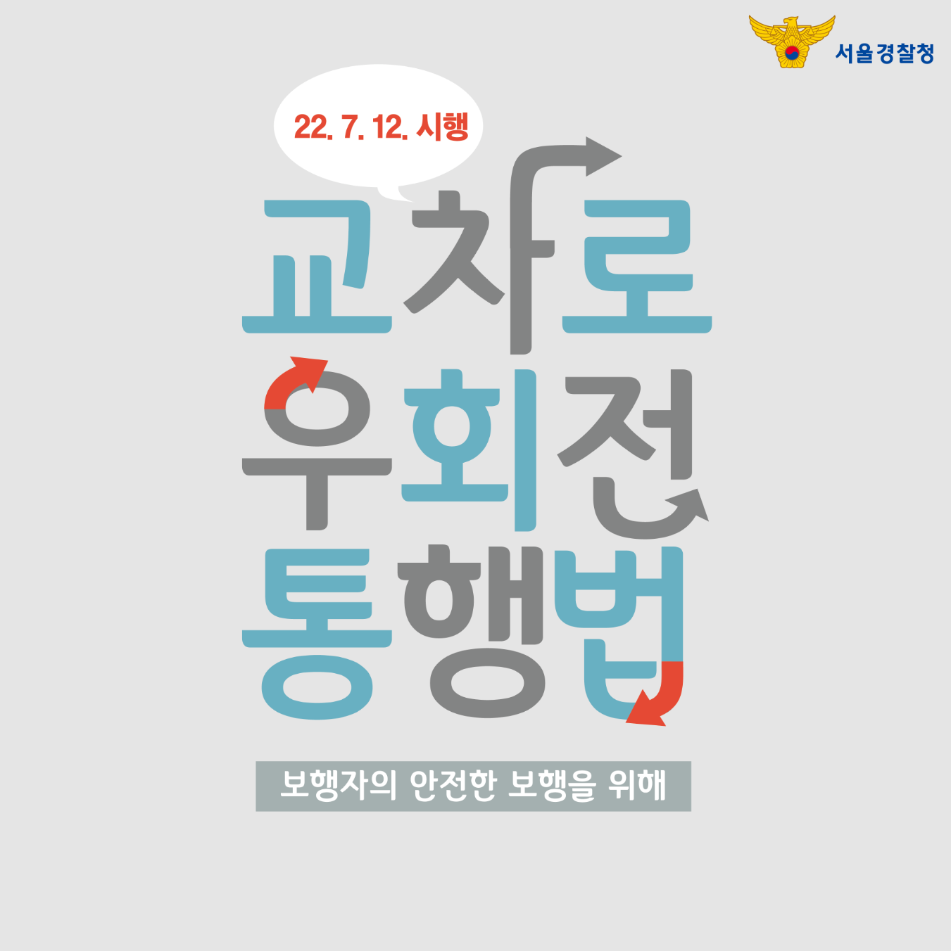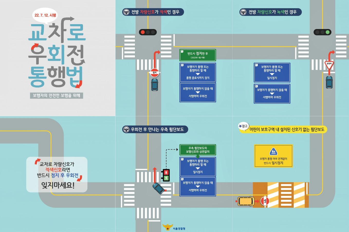 교차로에서 차량 신호등이 적색일 때 우회전하는 경우 정지의무 를 명확히 하고, 우회전 신호등을 도입하였습니다. (22년 1월 21일 공포 / 23년 1월 22일 시행)