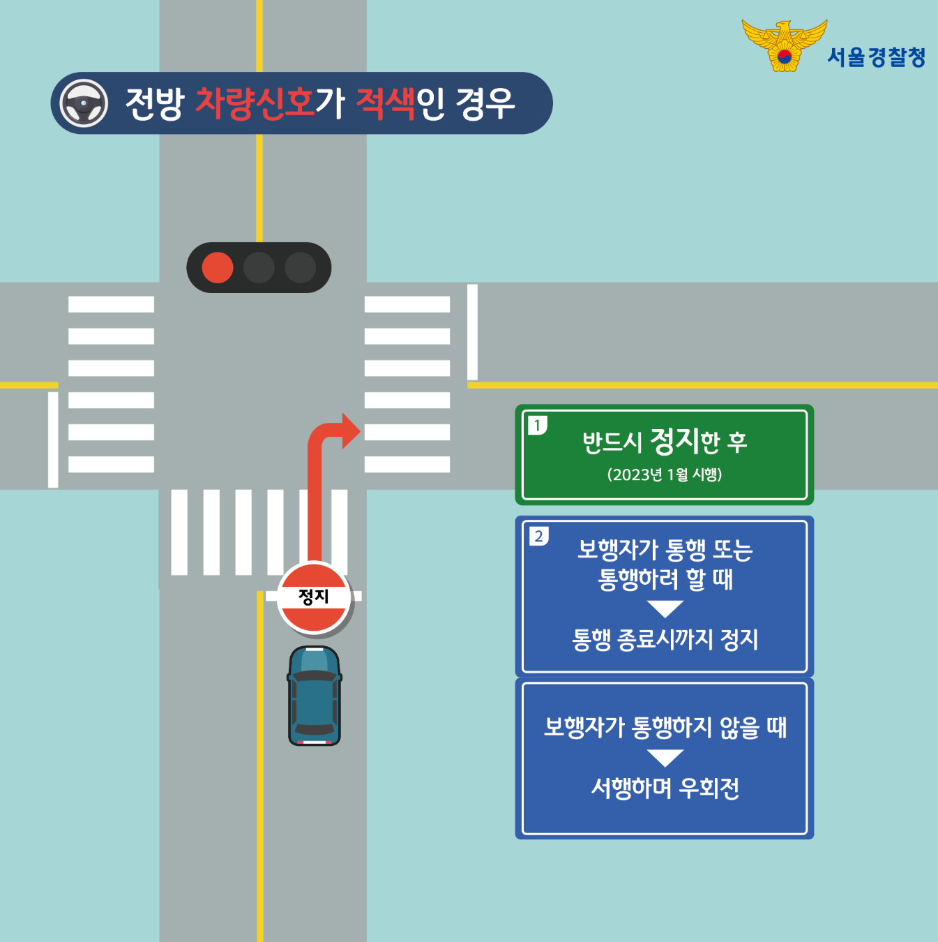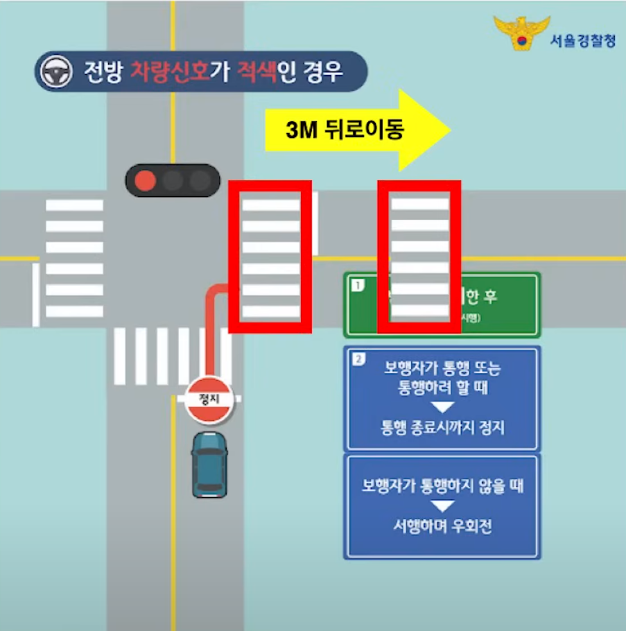 우회전 한 다음 바로 보행신호기가 있는 횡단보도에서는 우측 횡단보도의 보행신호(파란불)와 상관없이 위 2번 절차대로 우회전 하시면 됩니다.