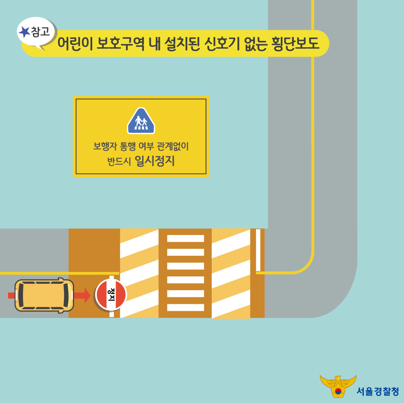 어린이 보호구역 내 설치된 신호기 없는 횡단보도에서는 보행자의 통행여부와 관계없이 반드시 일시정지 합니다.