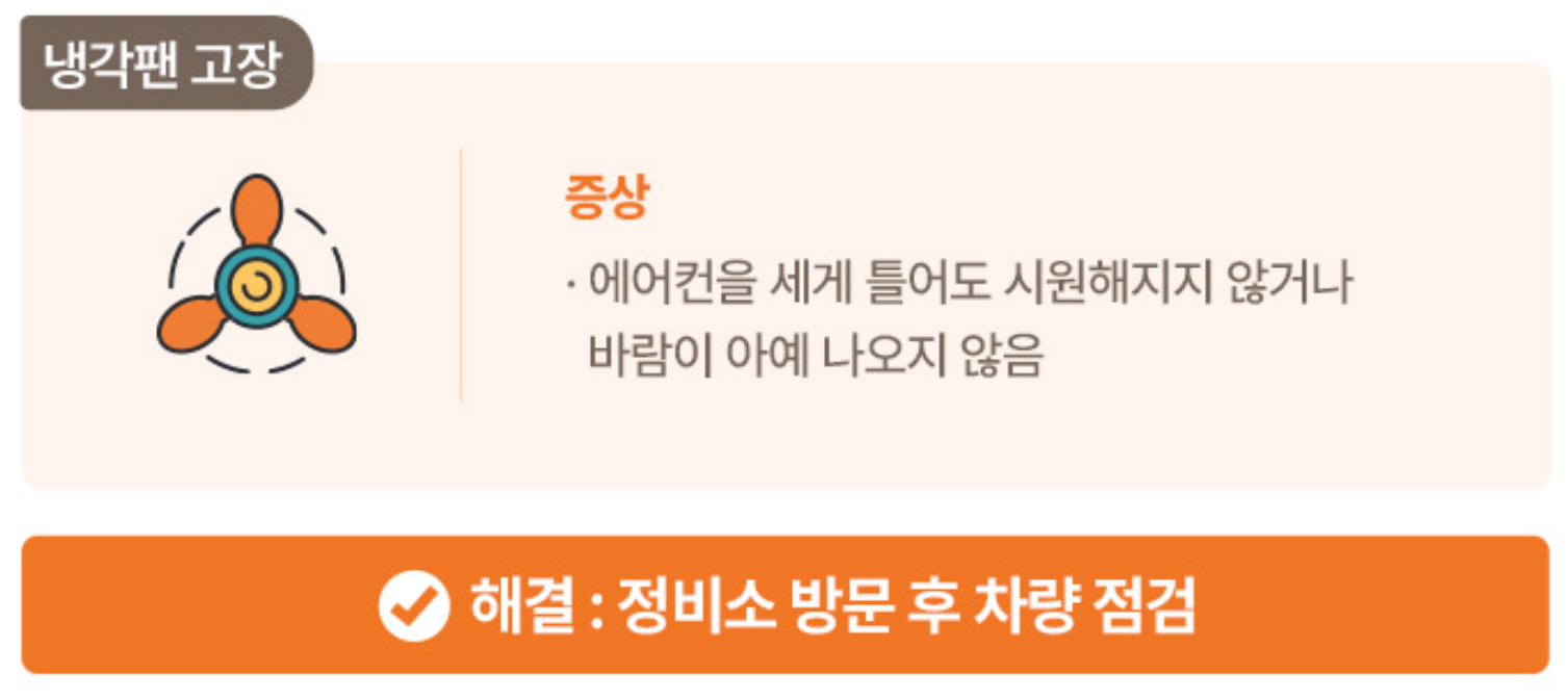 이러한 문제를 미리 점검하고 관리하는 것은 차량의 성능을 유지하고, 쾌적한 운전을 돕는 중요한 요소입니다. 꾸준한 관리로 더운 여름철에도 쾌적한 운전을 유지하시길 바랍니다.