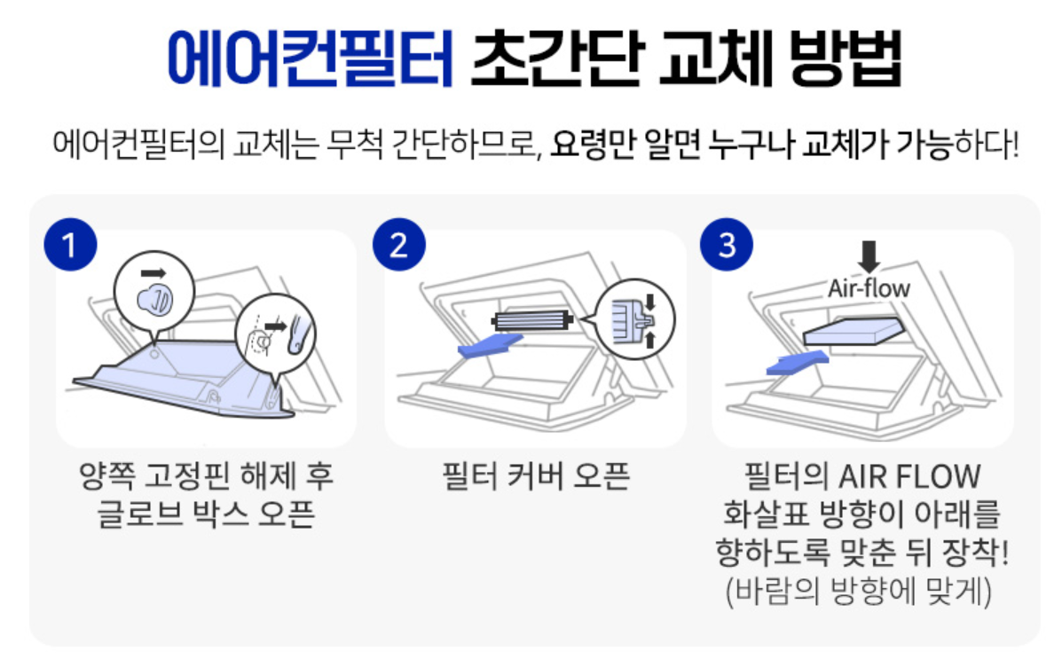 에어컨필터는 자동차 소모품 중에서도 셀프 교체가 쉬운 품목입니다. 자동차 구조가 특이하지 않은 이상 셀프교체를 권장드립니다.