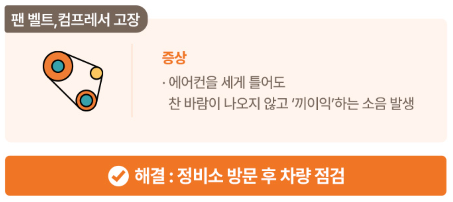 에어컨 바람이 전혀 나오지 않거나, 에어컨 작동 시 이상 소음('끼이익') 발생된다면 정비소에서 자동차 콤프레샤나 팬 벨트 정비를 받아보시기 바랍니다.