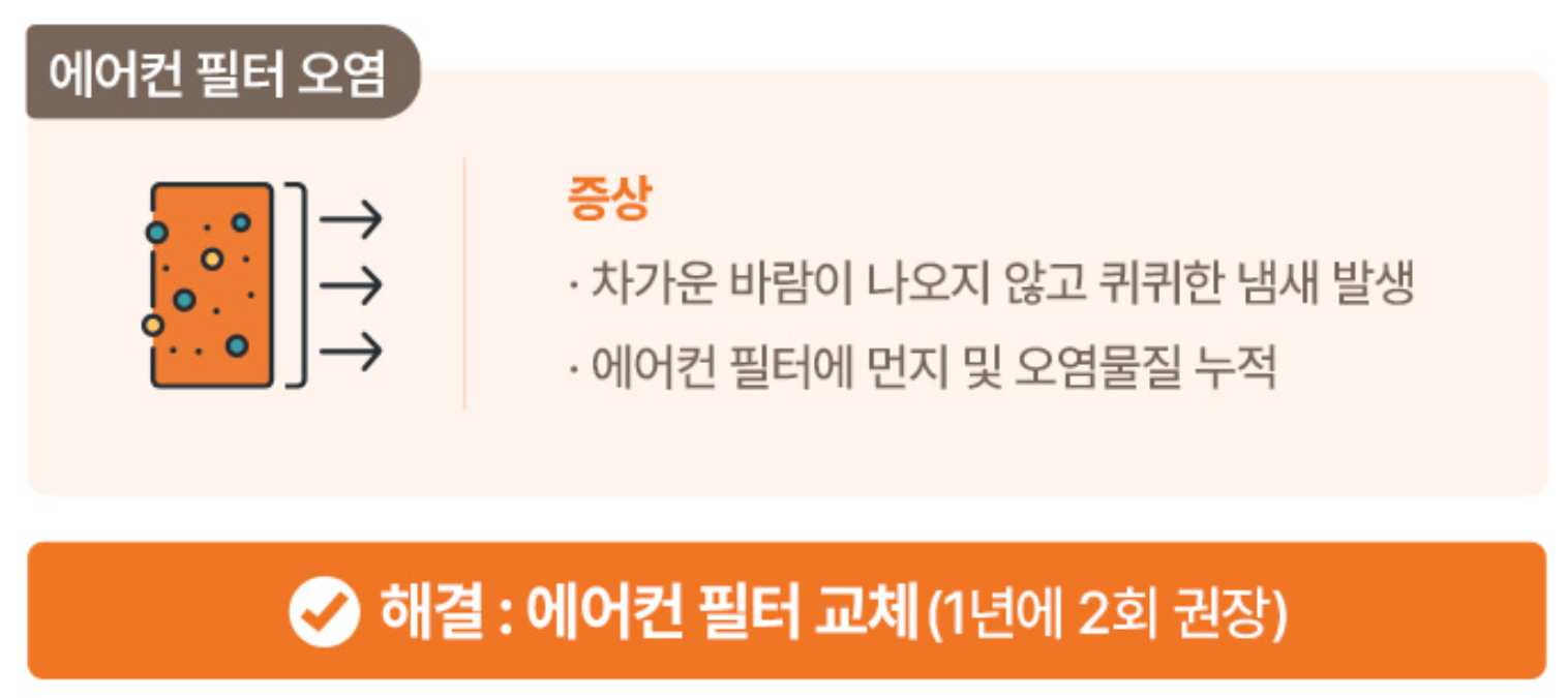 - 에어컨 필터가 더러워지면 악취의 원인이 될 수 있습니다. 필터를 점검하고 교체하세요.