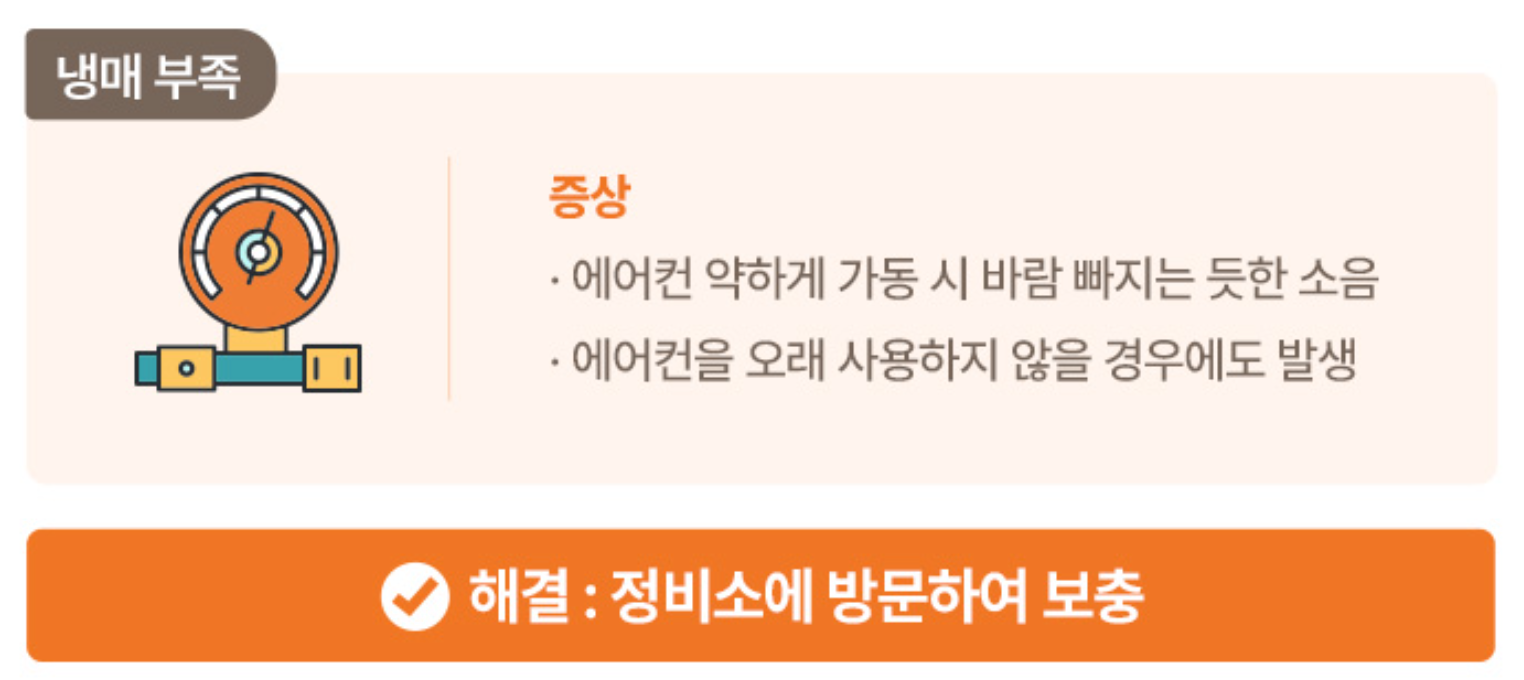냉매는 자연스럽게 약간씩 누출될 수 있으며, 오랜 시간 사용하지 않거나, 냉매 시스템에 문제가 있을 경우 부족 현상이 발생할 수 있습니다.