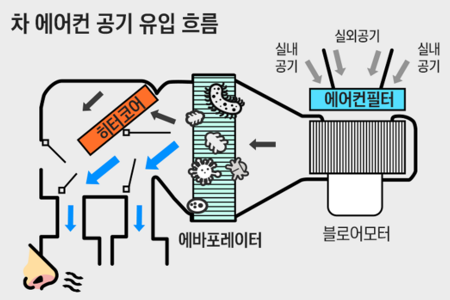 - 원인: 증발기 내 곰팡이 및 박테리아 축적, 더러운 에어컨 필터 등.